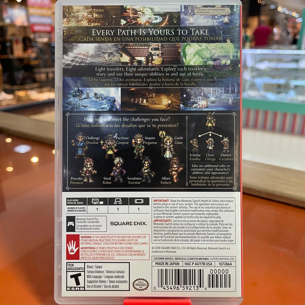 Octopath Traveler es un videojuego de rol desarrollado por Square Enix, en colaboración con Acquire. El juego fue lanzado para Nintendo Switch en julio de 2018, para Microsoft Windows en junio de 2019, para Stadia en abril de 2020 y para Xbox One en marzo de 2021. Wikipedia