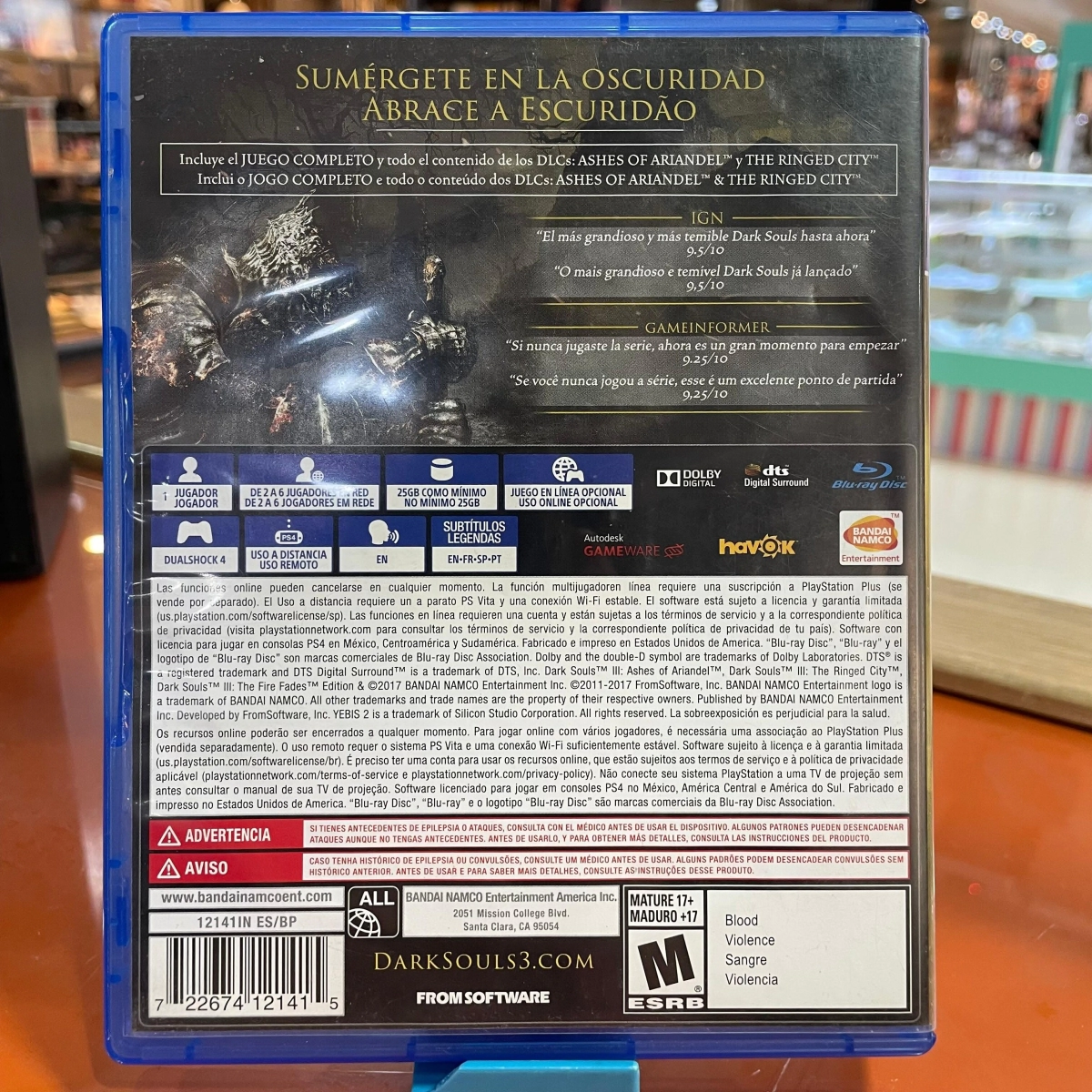 Dark Souls III es un videojuego de rol de acción desarrollado por FromSoftware y publicado por Bandai Namco Entertainment para PlayStation 4, Xbox One y Microsoft Windows. Es la tercera entrega en la saga Souls, ? Dark Souls III fue lanzado en Japón en marzo de 2016, y de manera mundial en abril del mismo año.? Wikipedia